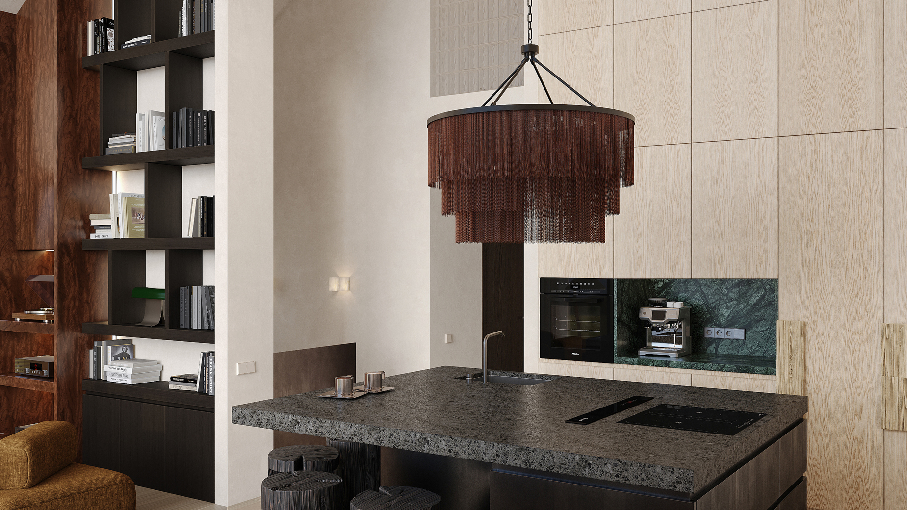 Toliau už miesto kuriamas gyvas ir drąsus interjeras. Namas alsuoja unikalumu bei funkcionaliais sprendimais. Sodrios spalvos, teksturų gausa, natūralumas bei autentiškos detalės čia kuria atmosferą ir norą tiesiog būti.